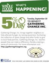 What is 5% Day? Whole Foods Market has a program where they assist local charities in their mission by donating 5% of their pre-tax profits on a given day to that charity. On September 10, Gathering Change, Inc. will be the recipient of Whole Foods/Woburn 5% Day. Gathering Change, Inc. raises hunger awareness and funds for our neighborhood food pantries and the money raised on September 10 will be directed to Woburn food pantries. The shopping hours are 8 am to 9 pm. For more information about Gathering Change, Inc., please see www.gatheringchangeinc.org. The Woburn Whole Foods is located at 400 Cambridge Road, Woburn, 01801, (www.wholefoodsmarket.com).