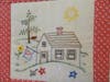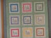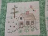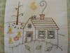 The quilt has a calendar theme, with each square showing a house surrounded by seasonal images representing each months of the year. For added measure, a little cat can be found in each of the squares as well.