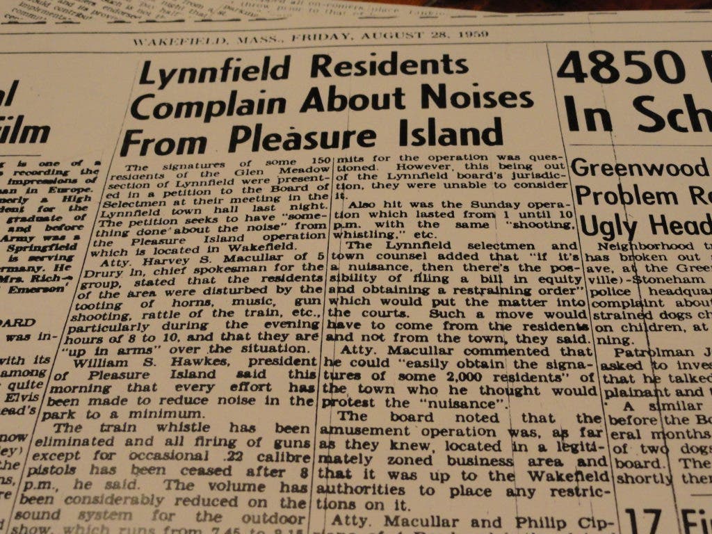 In a recent interview with Lynnfield Patch, McLaughlin talked about some of the town's connections to this one-time landmark on the other side of the meadow. The first thing he cited was an article in the Wakefield Item from August 28, 1959 bearing the headline "Lynnfield Residents Complain About Noises From Pleasure Island."