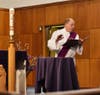 Photos by Marie Lagman; Chris Donoghue (Evangelization Consultant for the Archdiocese of Boston), Father Paul Ritt (Pastor, Lynnfield Catholic Collaborative), Donna Hegan (Lynnfield Catholic Collaborative Pastoral Associate); Deacon Ed Elibero blessing the water in the baptismal font at Our Lady of the Assumption Church.
