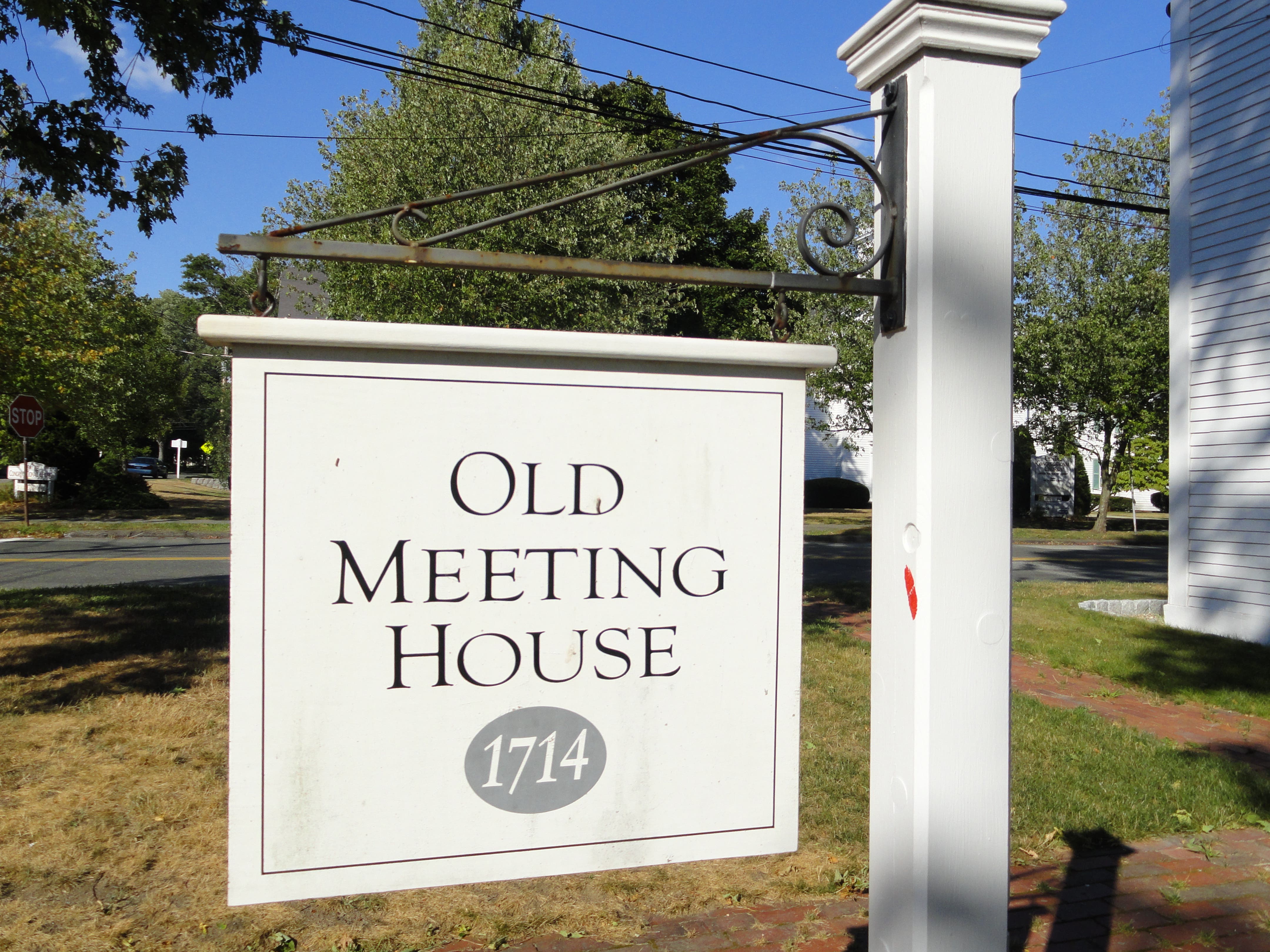The Meetinghouse Goes To England: In 1906, somebody mailed this postcard of the old Meeting House to somebody living in Dorset, England. The seller, an English person who thinks this is “Exeter County,” is asking about $3 U.S. for this, although it is less attractive to collectors with the stamp removed. The original sender also had very little to say, since his half-legible message seems to consist of maybe four or five words. Fortunately, this image does offer an interesting look at the Old Meeting House property (even if this vantage point has appeared in this column before), before the bell or the town Christmas tree were there. This postcard also shows South Common Street as a dirt or gravel road.
