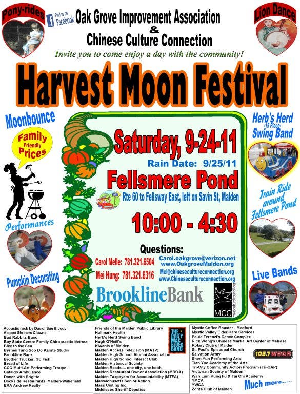 Oak Grove Improvement Association and the Chinese Culture Connection invite you to enjoy a day with the community at this family-price-friendly event! The theme of the festival is based on combining a traditional "Harvest Fest" with the Chinese "Moon Festival" to create the Harvest Moon Festival! A wonderful welcoming and fun atmosphere is created by by many civic organizations and businesses. A variety of delicious food is offered by the Malden Restaurant Owner Association at this fun-filled day for all ages! The 7th annual Harvest Moon Festival is full of Activities, Games, Live bands including the Dirty Mac Blues Band, Herb's Herd 15 piece swing band, Malden's own Bad Rabbits and acoustic rock with David, Sue and Jody. Performances by Dance with Brigitte, CCC Multi-Art Performing Troupe, Byrnes Tang Soo Do Karate Studio, Rick Wong's Chinese Martial Art Center of Melrose, Tian Ye Academy of the Arts, Wah Lum Kung Fu & Tai Chi Academy and Paula Terenzi's Dance Complex !Pony Rides, Pumpkin Decorating, Train Ride around Fellsmere Pond plus much more!