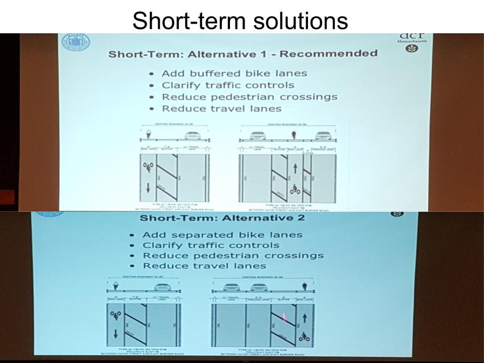 There was much less disparity between the short-term solutions - both would clarify traffic controls, reduce pedestrian crossings so they would have less road to cross, and reduce travel to just one lane from Savin Street to East Border Road with the use of pavement markings.