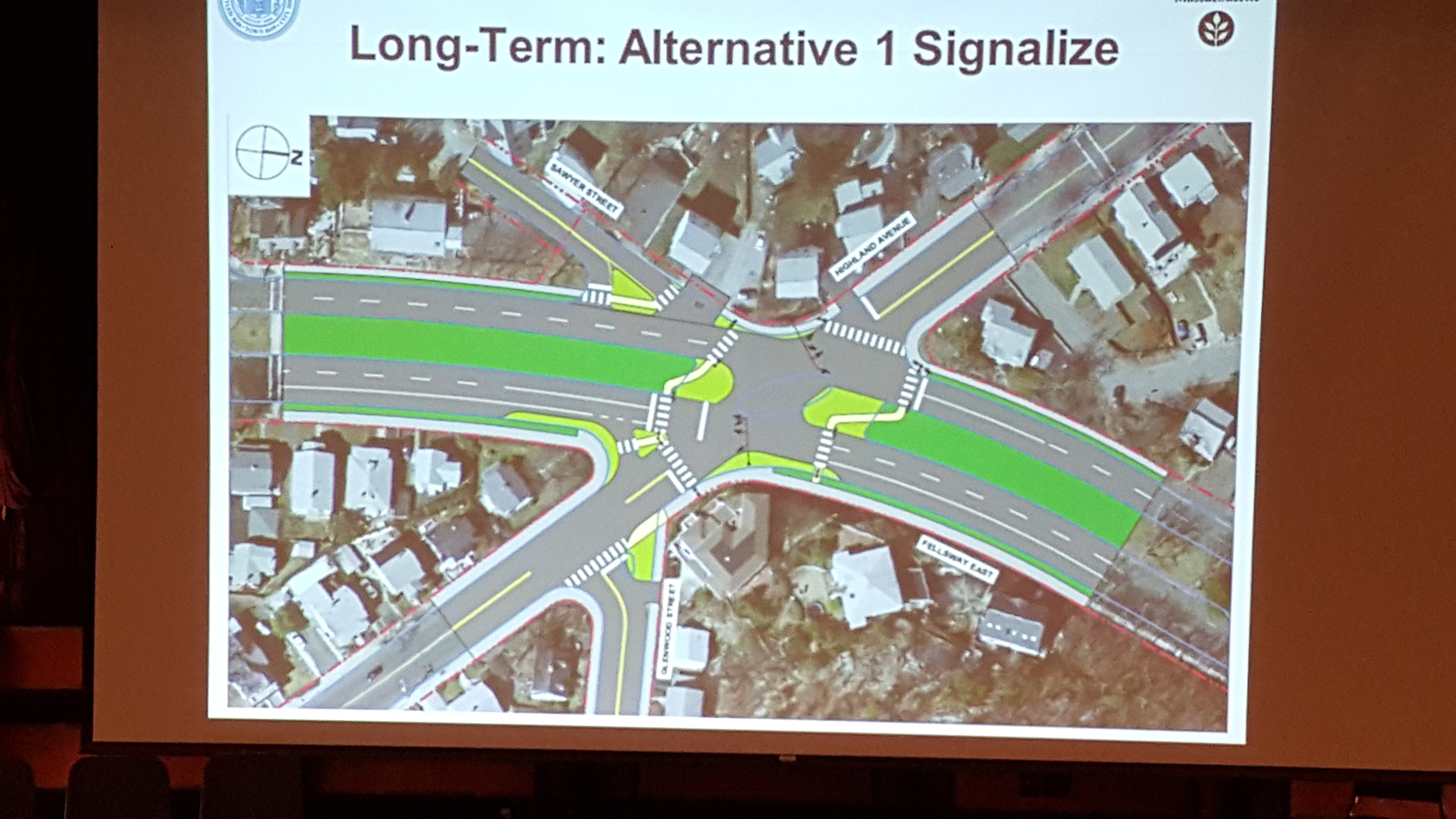 The signal alternative gets rid of the awkward island in the middle, puts traffic lights where signaled in the photo above, extends the medians (the light green above), and makes for shorter pedestrian walkways. The lights would give preference to Fells traffic unless Highland Ave. traffic approached. Orrall called it "more of a normalized intersection." There would be two lanes so that idling traffic would not back up too much during a red light; one resident brought up an air quality concern with a number of cars sitting still for too long.