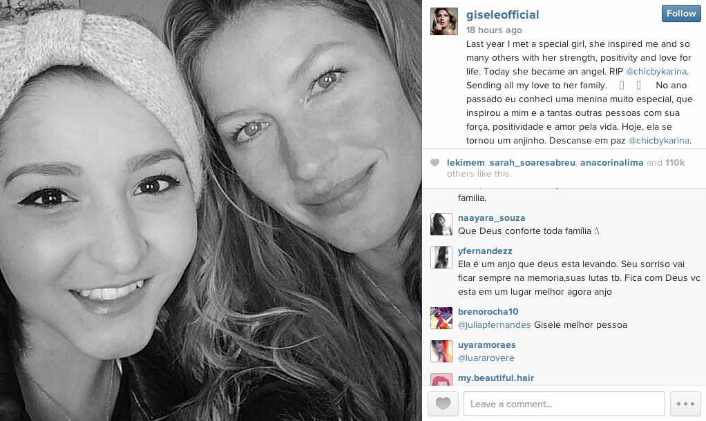 Fashion model Gisele Bundchen remembered Karina Moreira, a late Malden teenager who inspired thousands by starting a fashion blog, βchic by karina,β while battling cancer, in an Instagram post Thursday night.