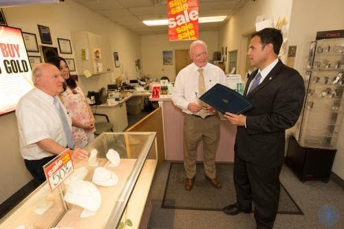 Photo: Malden Mayor Gary Christenson presents Liberty Jewelers owner Kevin Rigney (center) with a congratulatory citation. Left, Rigney’s longtime assistant, Donald Puopolo, and sales associate, Amy Gambino. Credit: Paul Hammersley, City of Malden.