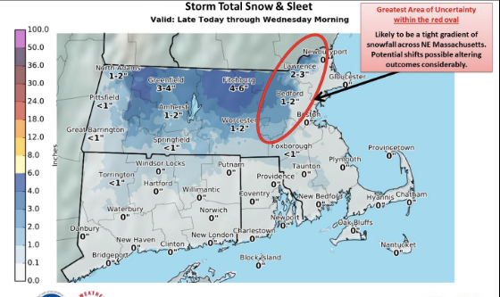 The rain/snow line in the Merrimack Valley area means the kind of precipitation and amount accumulation is still uncertain:
