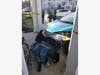A car crashed into the apartment building's entry way, causing substantial damage.