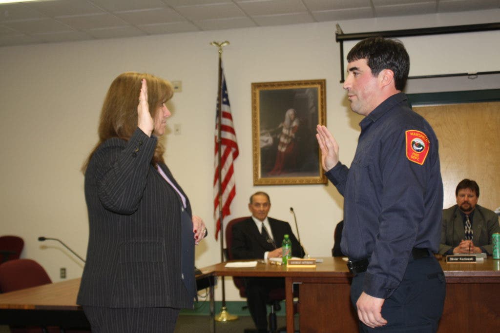 The swearing-in ceremonies in town continued last night at the selectmen meeting when Mike McLaughlin was sworn in as the town's newest firefighter.