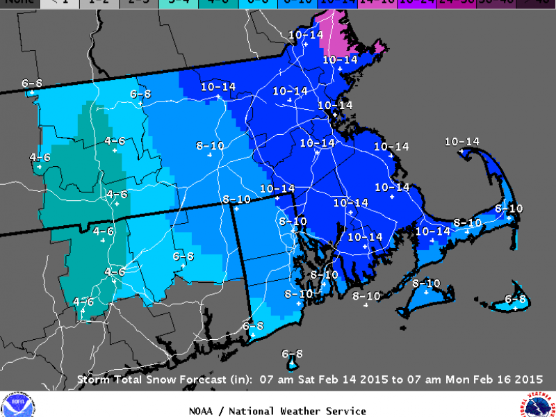 Most of Eastern Massachusetts is predicted to get 10 to 14 inches of snow. Snow is expected to start on Saturday afternoon and continue into Saturday night. Snow will stop for a time on Saturday night before returning and intensifying late Saturday night and becoming a blizzard early Sunday morning, according to the NWS.