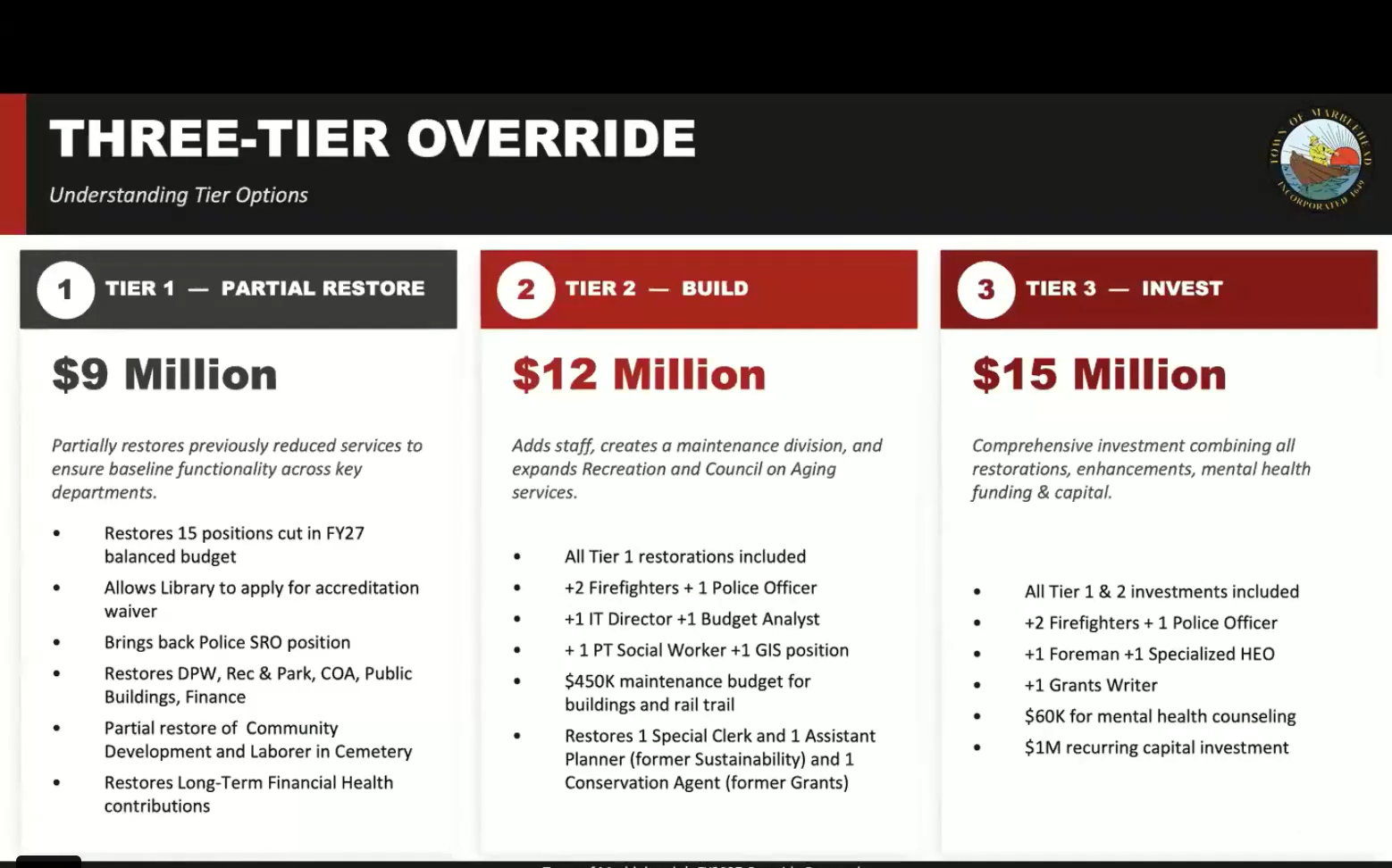 The Tier 1 is being presented as a "partial restoration" override that would restore 9 town staff position cuts and some town services. The $12 million "build" override would keep staff and services roughly at current levels, and the $15 million "invest" override would begin to fill unfilled positions and make improvements that have been delayed or eliminated in recent years.