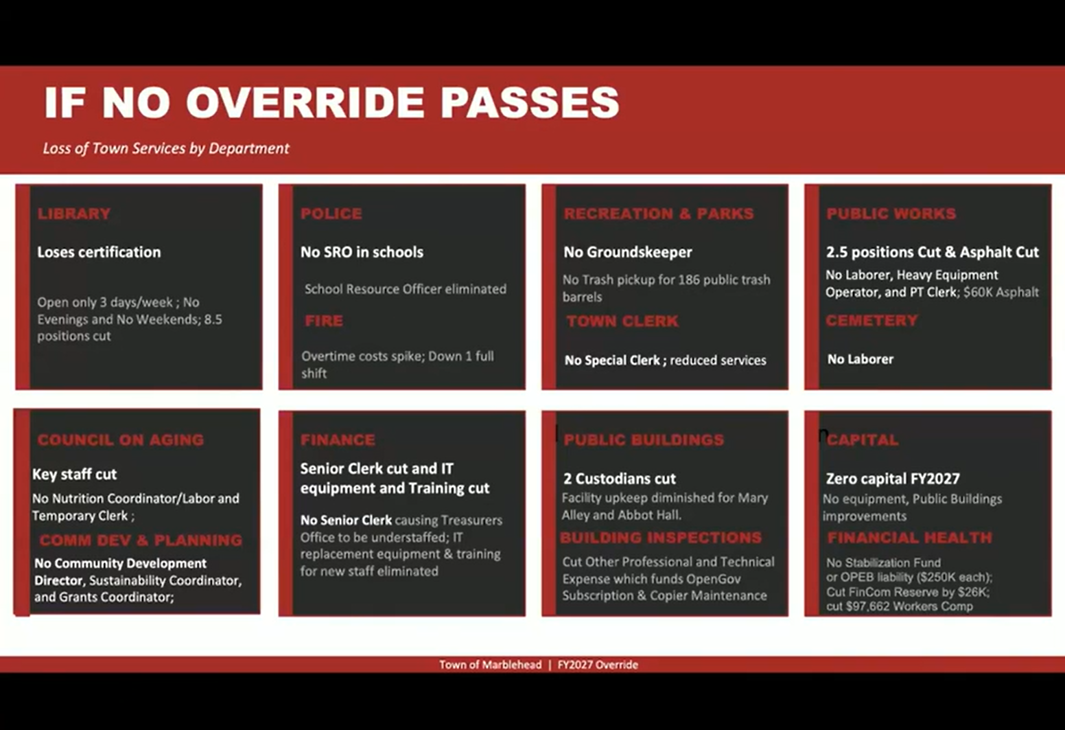 Town cuts would include the library losing accreditation being open only three days per week, eliminating the school student resource officer position, cutting one fire shift a week (which would necessitate a "spike" in overtime spending), as well as staff cuts to the Department of Public Works, Recreation groundkeeping, town building custodial services, clerks and town support staff, and the elimination of all capital project expenditures that are not already contractually obligated.