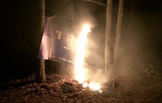 Nearby in Hollis, New Hampshire, another Trump sign was set on fire in June. And like the Marblehead case, the Hollis Trump supporter had been hit before.