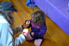 Parents held babies aloft. Children made a bouncy house jump and snapped Lego pieces in place.