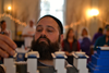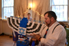 The rabbi led the shul in singing prayer. He lit candles atop the menorah, singing and swaying as he lit the wicks.