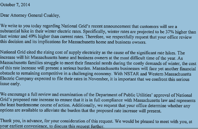 In the Oct. 7 letter authored by Senator Ross, which was also sent to Governor Deval Patrick, chair of the Department of Public Utilities Ann Berwick, and Secretary of the Executive Office of Energy and Environmental Affairs Maeve Vallely Bartlett, the Caucus wrote, “As Massachusetts families struggle to meet their financial needs during the costly demands of winter, the cost of this rate increase will present a serious burden. Massachusetts businesses will face yet another financial obstacle to remaining competitive in a challenging economy.”
