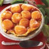 Remove from the oven and gently ease a knife all the way around the edge of the tart.. Place a large heatproof plate upside down on the top of the skillet and quickly turn over the pan and plate, releasing the tart onto the plate. Lift off the skillet to reveal golden brown apples and a syrupy sauce.