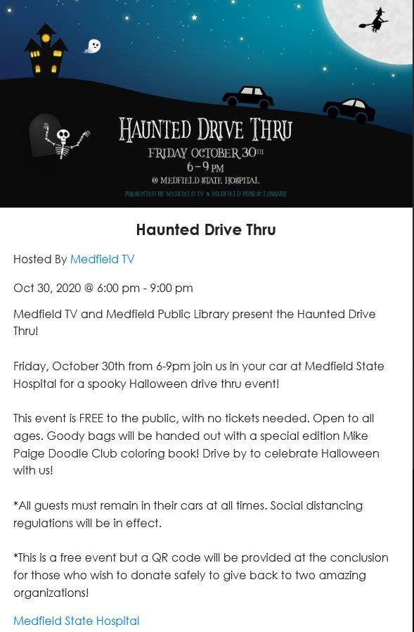 Medfield TV and Medfield Public Library Present the "Haunted Drive Thru" on Friday, Oct 30th from 6pm-9pm at MSH!