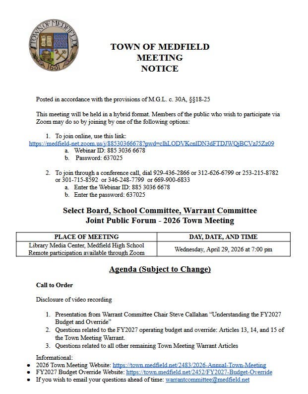 Joint Public Forum On April 29th regarding 2026 Town Meeting
