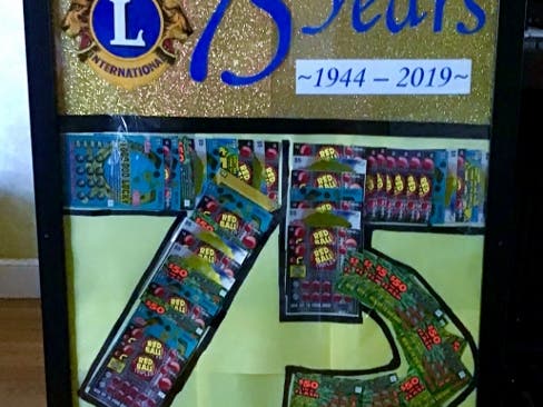 The Medfield Lions Club is celebrating 75 years of serving others, and to help spread the word about the Club, the Lions are holding a $350 worth of MA STATE LOTTERY TICKETS RAFFLE all displayed as "75".
