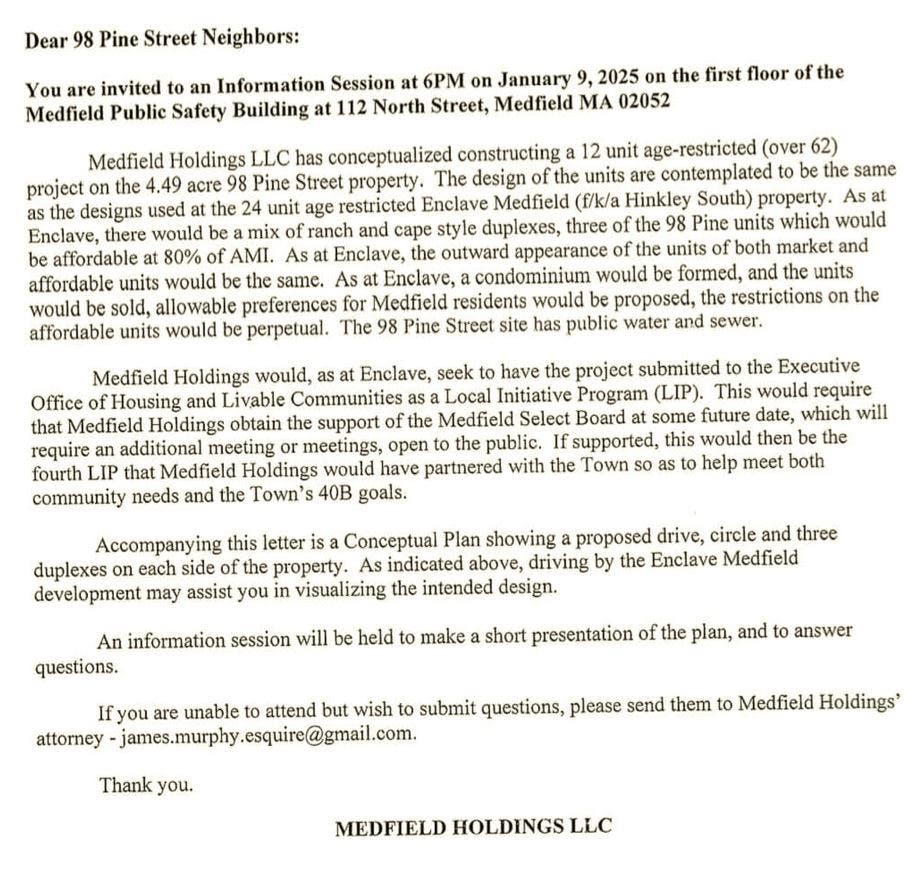 As shown in the letter sent to a butters, this development would be similar in style to Enclave Medfield (located near the Kingsbury Club and The Center at Medfield), with the plan to build 3 duplexes on each side of the property at 98 Pine Street equaling 12 residential units in total.