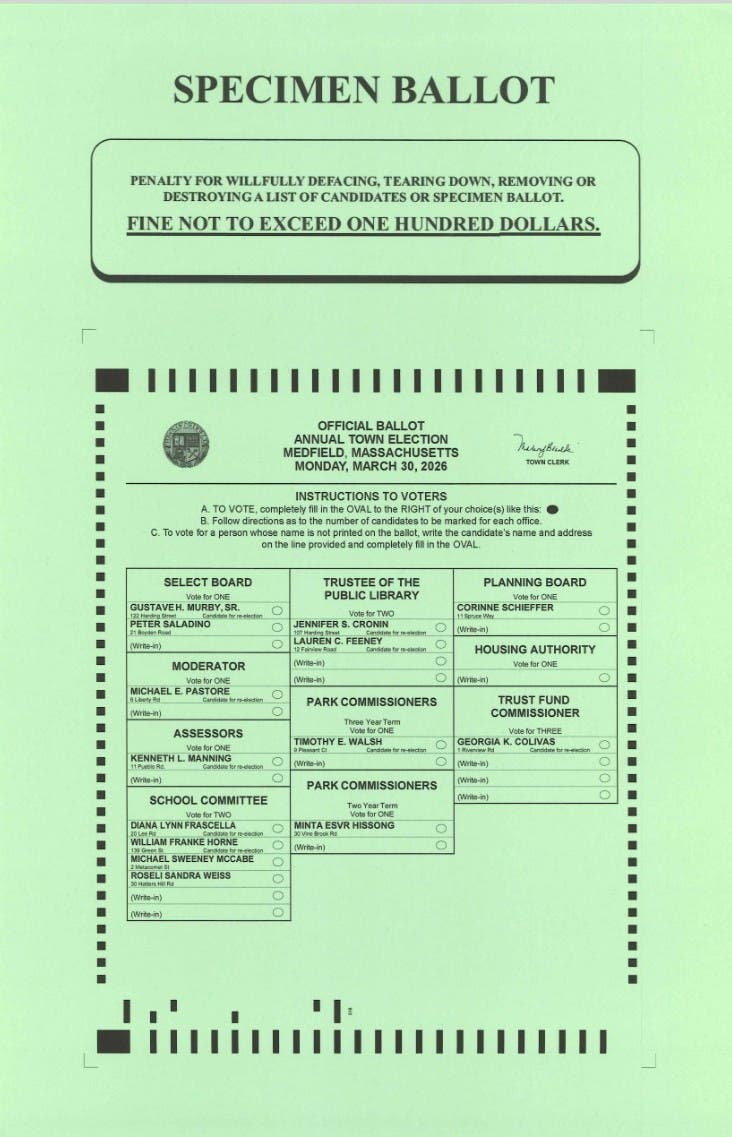 Today's Medfield Annual Town Election polls closed at 8pm and the votes are in. The only two contested races on the March 30, 2026 ballot were for School Committee and Select Board.