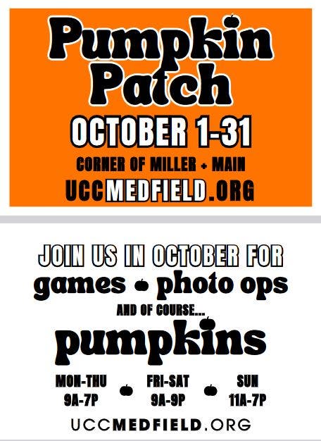Don't Miss Medfield's OCTOBER Pumpkin Patch at United Church of Christ Medfield for the entire month of OCTOBER!