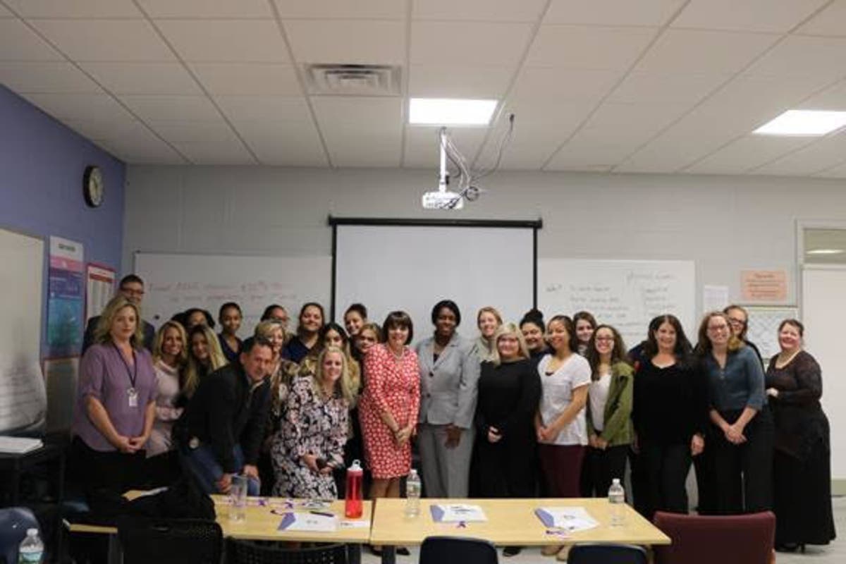 MEDFORD, MA – October is Domestic Violence Awareness Month, as part of the Middlesex District Attorney’s ongoing commitment to addressing this issue District Attorney Marian Ryan addressed 25 Medford Vocational Technical High School cosmetology students on ways to spot signs of domestic violence and how to safely refer clients to local community service providers as part of the Cut It Out Middlesex Program. District Attorney Ryan was joined by State Representative Christine Barber, Medford School Superintendent Dr. Marice Edouard-Vincent, Medford Police Detective Jim Ricciardi, High Risk Program Coordinator Victoria Heldberg from RESPOND Inc. and Portal to Hope Founder Deborah Fallon.