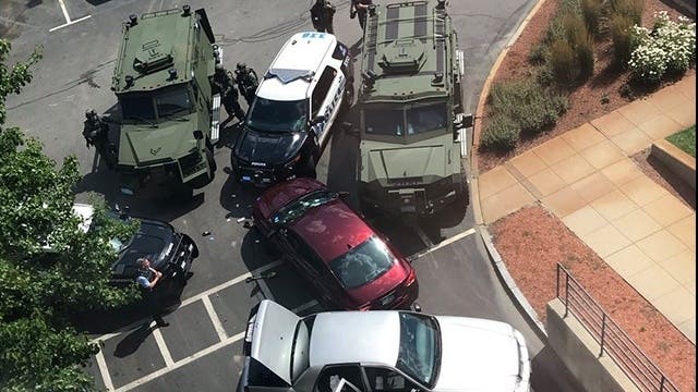 Newton allegedly threw an ax at police, who used non-lethal weapons in response. He got back into his car, but was taken into custody by police around 4 p.m., leaving in an ambulance. Footage from the scene showed police apprehending a man in a white sleeveless shirt outside the red sedan that had been surrounded for two hours.