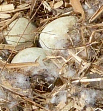 Swan eggs safely tucked into the reeds on the feathered nest.