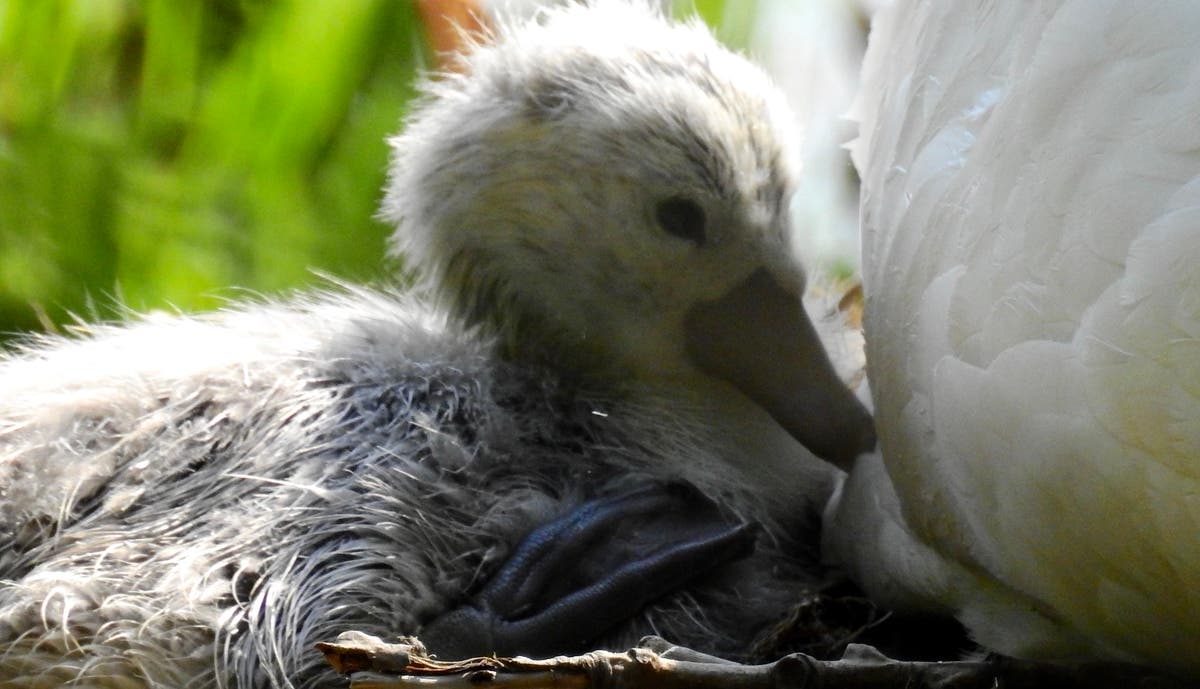 Newly hatched cygnet staying close to one of its parents, May 15, 018