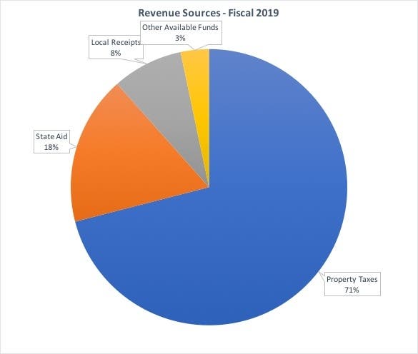 - State Aid is the second largest revenue source; it is projected to be about $14.5 million in FY 2019. Some of that returns to the state in the form of assessments for charter school tuition, MBTA assessment, and other items.