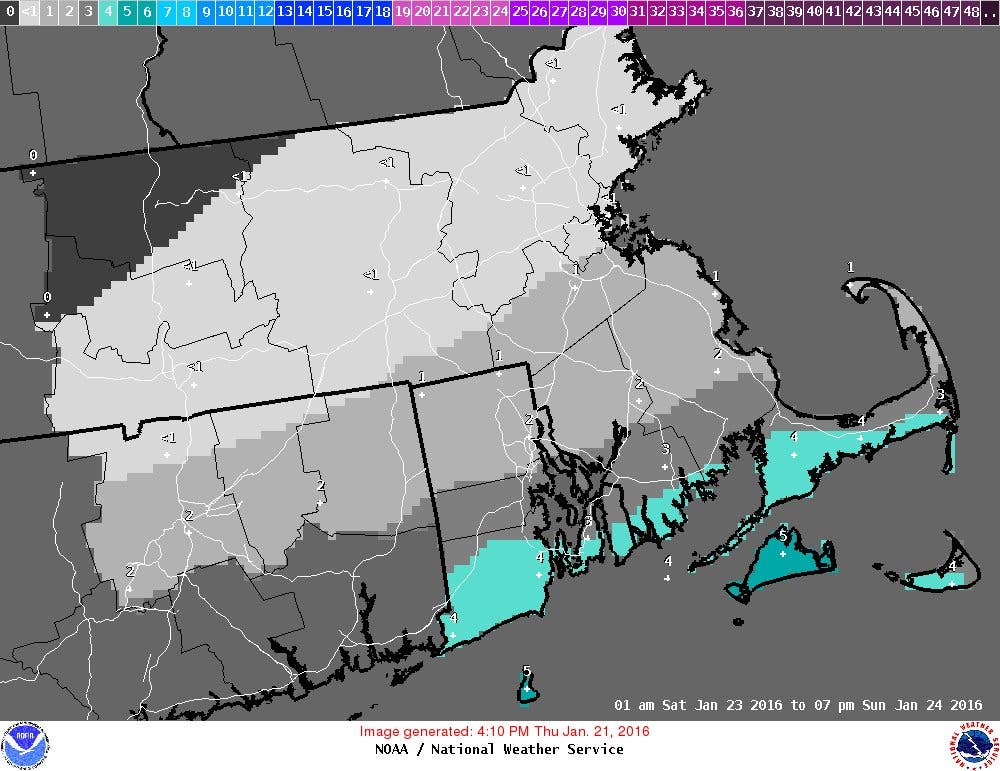 “We are somewhat more confident that the highest snowfall totals in southern New England will be confined to to the South Coast, Cape Cod, and the Islands (but a wintry mix could keep totals down on the outer Cape and Islands),” the NWS said in a 1:30 p.m. update. ”Odds starting to favor little or no impact from the Mass Pike to the New Hampshire border, although some snow is still possible across eastern Massachusetts from off the ocean (including Boston).”