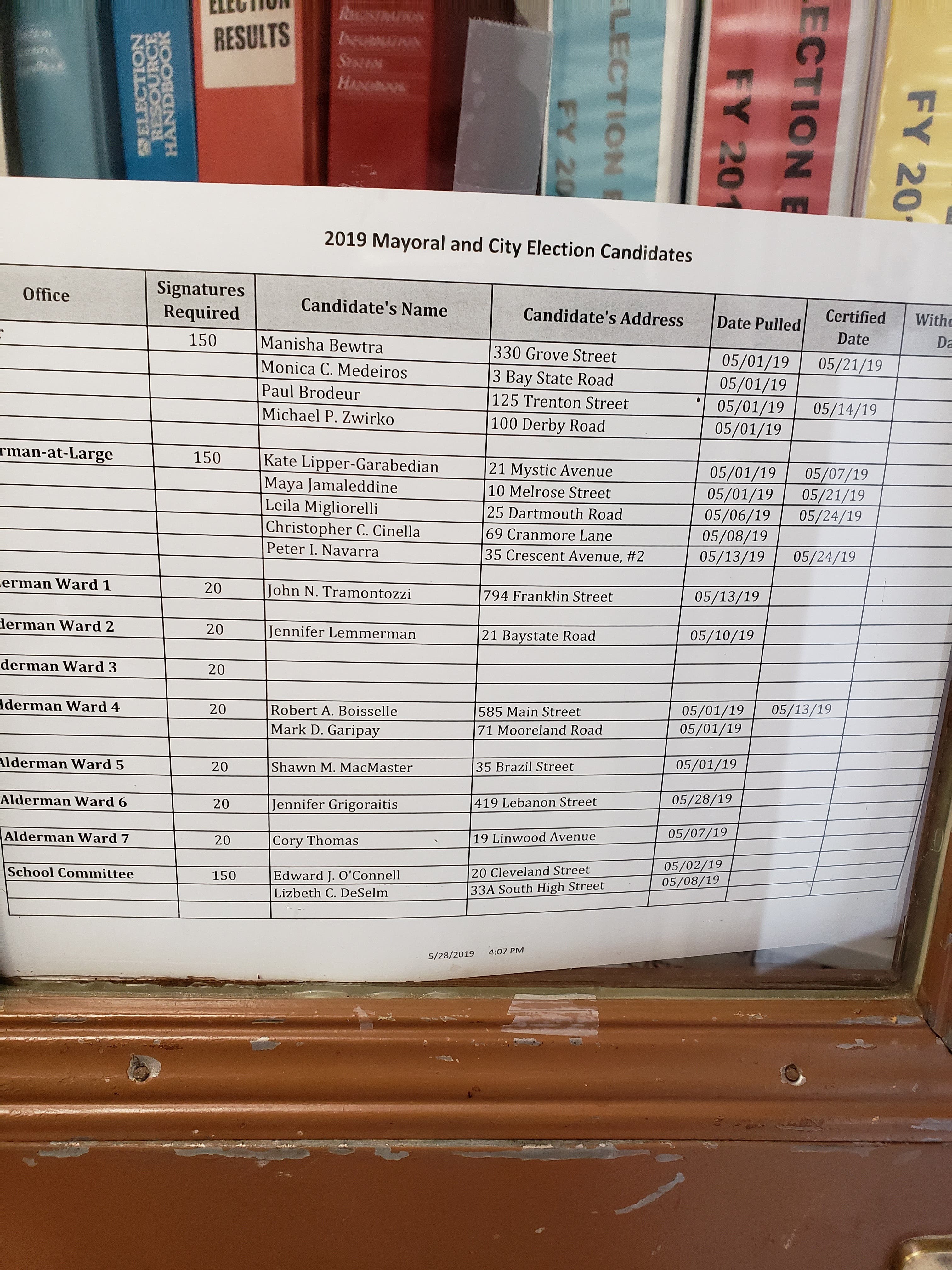 When you really have to pull out the Excel spreadsheet is when you consider the at-large situation. Kate Lipper-Garabedian is running for reelection, but Mike Zwirko, Monica Medeiros and Manisha Bewtra are running for mayor. (State Rep. Paul Brodeur is also running for mayor.)