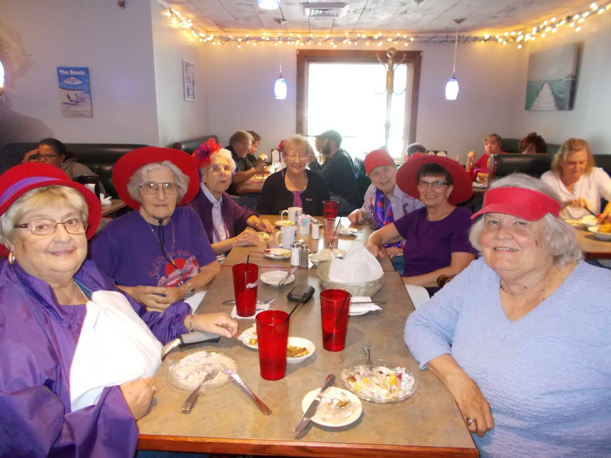 The weather was magnificent, a cool breeze, beautiful sky and a view of the lake. We had chips, cherries and cold drinks for openers. When it was time to eat things worked out as usual, we had no duplicates. There were salads, chicken, meat balls (two kinds) potato salad, shrimp, and an impossible pie. Desserts was a wonderful small cookies stuffed with raspberry. What a feast! What an outstanding Red Hat Day!