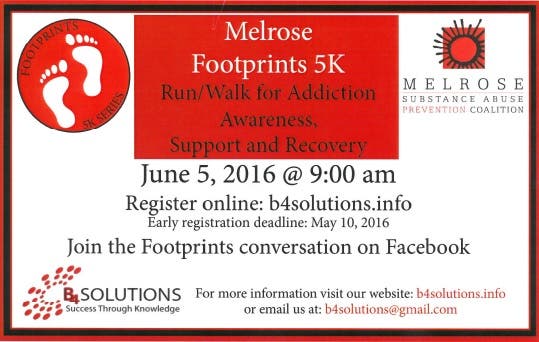 Please join the Melrose Substance Abuse Prevention Coalition in our 2nd Annual Footprints 5K Run/Walk on Sunday, June 5th at Pine Banks Park in Melrose, MA. This will be the first race in a three-part regional series aiming to raise awareness about substance use disorder (SUD), promote support for recovery, and acknowledge our local police, fire, EMT’s, Melrose-Wakefield Hospital staff, and any first responder or community member who works hard to fight SUD and overdoses every day.
