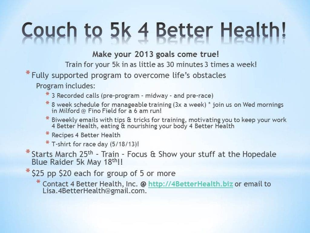 4 Better Health, Inc is running a Couch to 5k program starting THIS WEEK! Grab a friend and JUMP IN! You will be amazed at the ease of the program, the guided support will empower you to succeed and we will overcome your obstacles together. Gain lifelong knowledge 4 Better Health through a weekly group run at Fino Field, recorded calls, recipes and biweekly emails.
