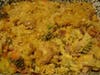 Cook potatoes and pasta until just tender, I cooked them together in the same pan. Drain and pour into a greased 9x11 baking pan. Combine ham, vegetables and onion in same pan and mix well. I seasoned with garlic powder and pepper.
