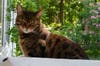 HE IS A 7 YEAR OLD BENGAL. HE IS A NEUTERED MALE WITH GREEN EYES, A BROWN COAT WITH BLACK SPOTS. HE ALSO HAS BLACK STRIPES ON LEGS, TAIL & HEAD. HE HAS A VERY SMALL BALD SPOT NEAR HIS LEFT EAR. HE DOES NOT HAVE A COLLAR. HE HAS A MICROCHIP LOCATED NEAR HIS SHOULDER. HE IS UP TO DATE ON ALL HIS SHOTS. HE HAS A SLIGHT HEART MURMUR.