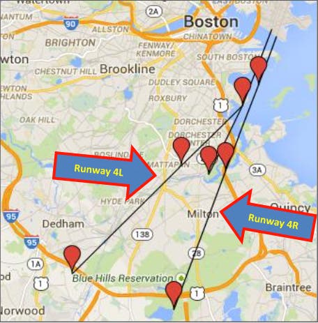 With no public warning given to residents or local officials by the Federal Aviation Administration (FAA) and Massport, runway 4L that flies over Milton, Hyde Park, Mattapan and Dorchester could become a concentrated highway in the sky as early as this week. It is scheduled to bring thousands of additional low flying flights per year, similar to the other RNAV flight paths that have burdened Milton for the last two years as the FAA sought to narrow flight paths instead of dispersing planes over a wider geographic area.
