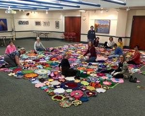 Girardin is a local artist with a studio less than a block away from the public art exhibit. She said she was inspired to start the project after seeing a post online of a similar project done in France. "I made it the background of my computer, I kept coming back to it, I don't know why I was so drawn to it, I just was," she said. She decided to try to make it happen and reached out to Karen Perkins of the Morse Institute Library. Perkins runs the stitching club in the library with Fran Weisse and agreed to help get the project going.