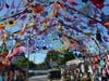 NATICK, MA — Natick's downtown pedestrian bridge linking North and South Avenues has been transformed into a kaleidoscope of color, all made of yarn and all made from local residents. The "Tunnel of Love" public art project was meant to bring color to commuters lives and get the community involved in art.
