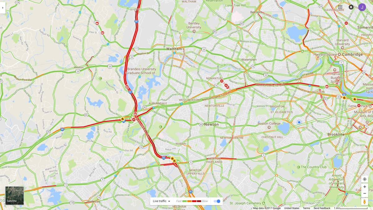 NEWTON, MA — WBZ Radio traffic watch is reporting a crash involving a truck and an overpass near Grove Street in Newton - one of may crashes this evening on 128, including one at Rt. 2 in Waltham. If you need any more reason to stay away from Rt. 128, check out the current traffic view of Google Maps of the roadway.