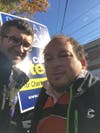 Photo 1: âWeâre hearing turnout is low,â said Bryan Barash, who is running for Newton Charter Commission. âI feel really confident about my chances.â Pictured is Barash at ward 1 with supporter Richard who works at NewTV.