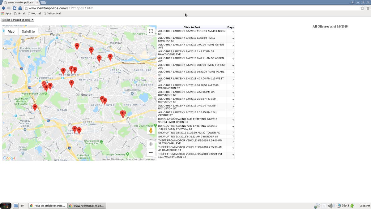 Larcenies: Police got calls about larcenies at The Falls at Cordingly Dam on Washington Street, Panera Bread on Centre Street, and at Medical Resources Homehealth on Nevada Street.
