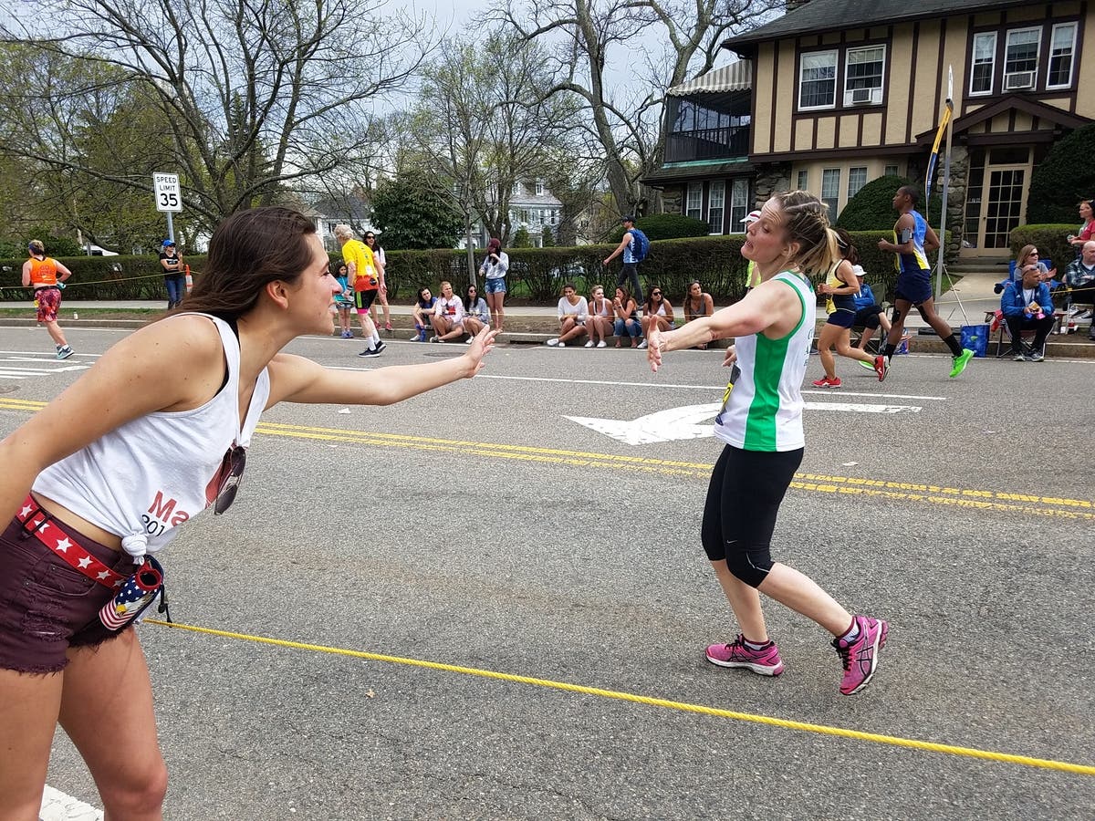 NEWTON- Right across from Mile Marker 21, Chelsea Binnig, a junior at Boston College, is cheering on runners and leaning out across the thin yellow rope meant to separate spectators from the crowd of Boston Marathoners as they leave Heartbreak Hill in Newton and head down Commonwealth. She offers them high fives along with words of encouragement.