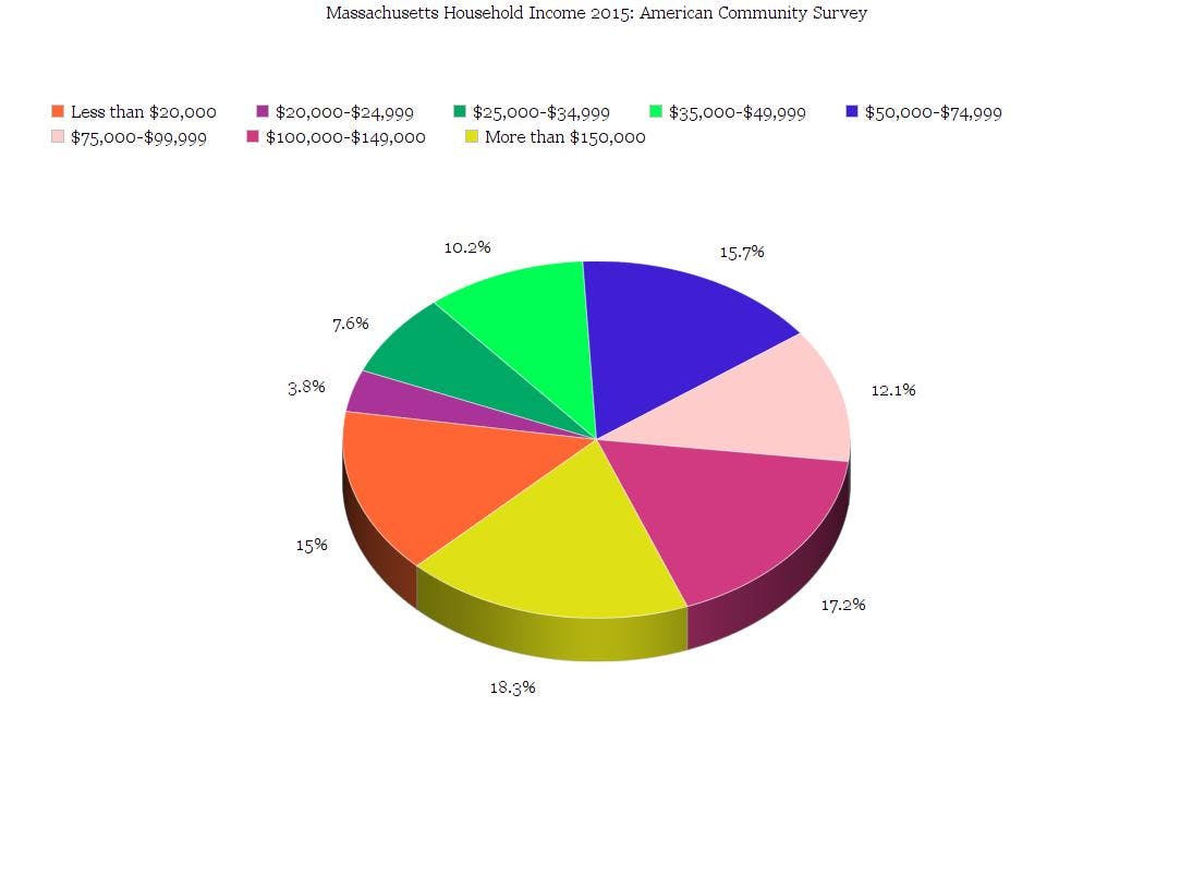 Nationwide, the median household income for 2015 was $56,000, the American Community Survey data shows. In Massachusetts, that number last year was as $70,628, compared with $69,160 in 2014.