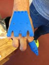 Walsh said the hand is âlike a glove.â The fingers slide snugly over this stump/last joint of his fingers. The braided fly fishing line extends from the bottom of the finger tip back across the knuckle to the wrist mount. An elastic cord connects that finger tip to the cap.