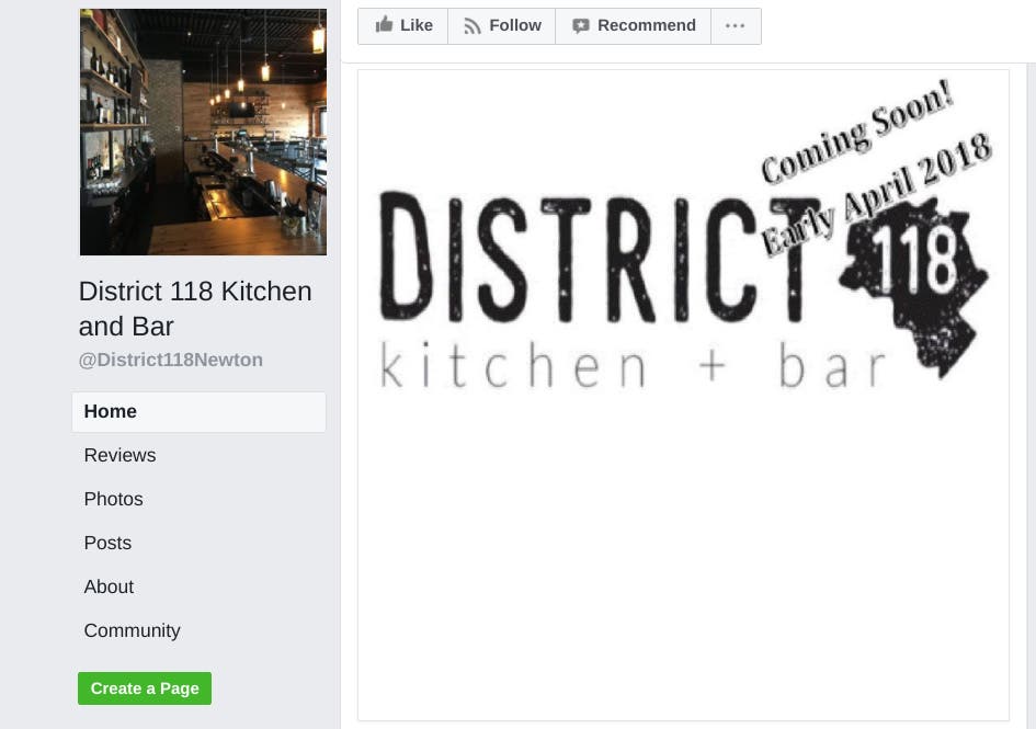 District 118 Restaurant and Bar is aiming for an April opening, according to their Facebook page.