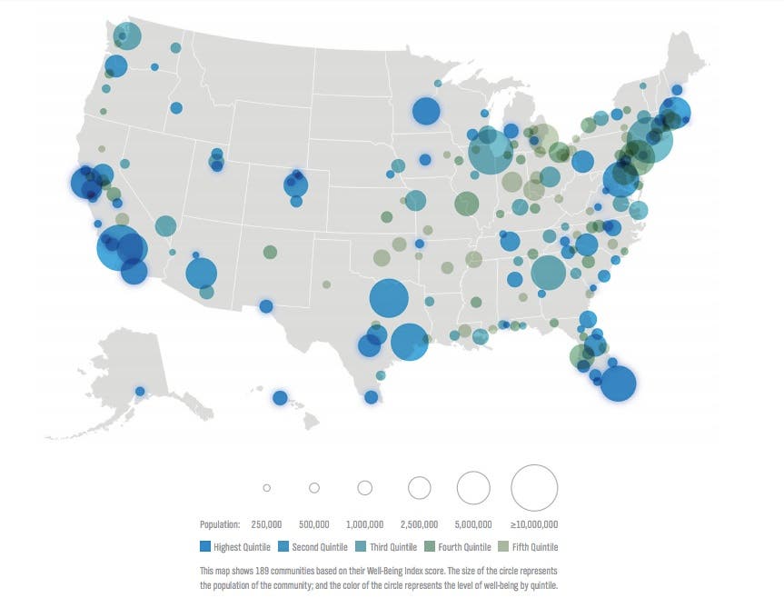 "Where you live can impact your health and well-being," said Michael Acker, of Healthways, which collaborated with Gallup on the poll. "Innovative leaders are transforming their communities to create improvements in how people socialize, work, eat, play and move. These changes are empowering citizens to make healthier choices, be more productive and have better quality of life. Employers, health systems and community leaders are poised to create positive change by promoting meaningful and measurable actions towards better well-being. And, by doing so, they invest in a brighter future for all."